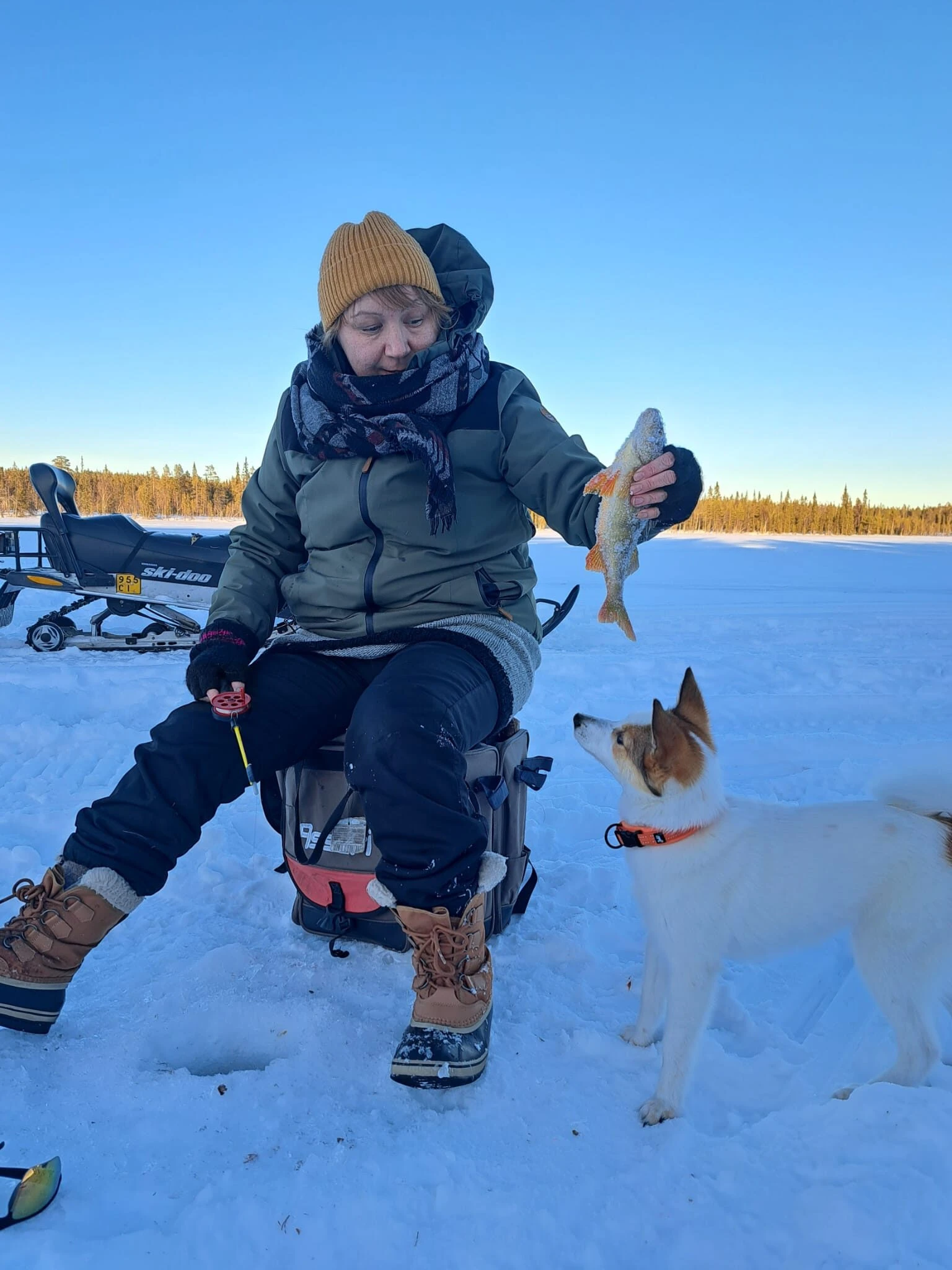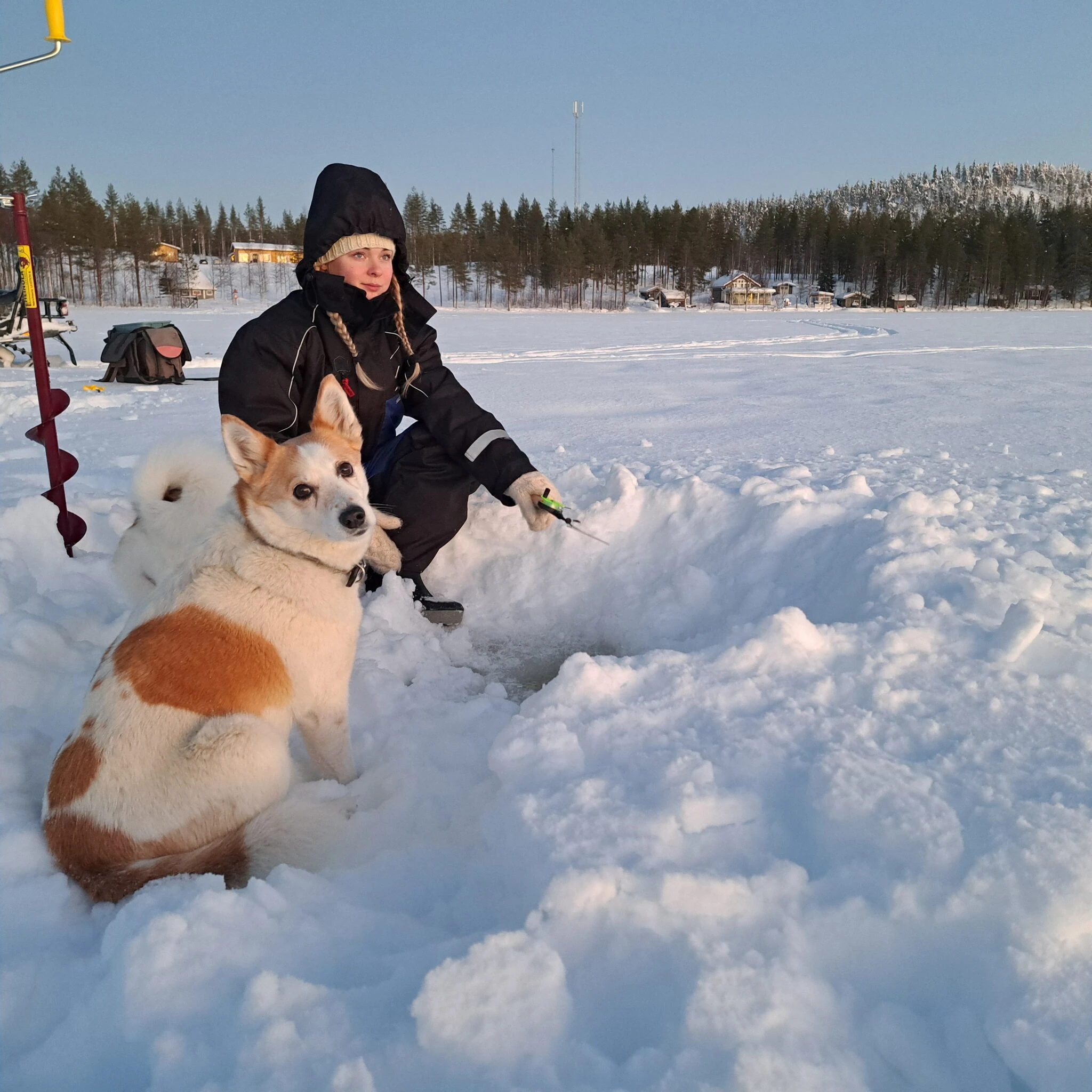 * The hostess Virve or another local will transport fishing equipment and the dogs by snowmobile and sleigh.